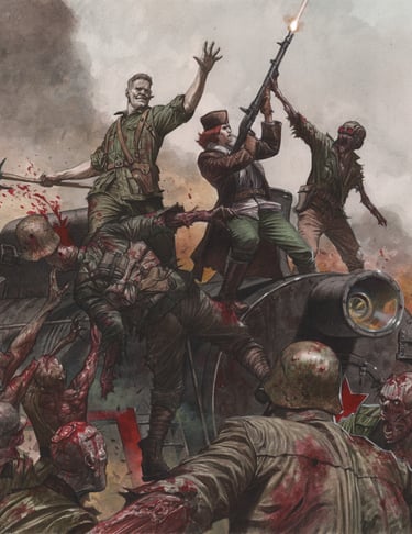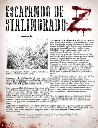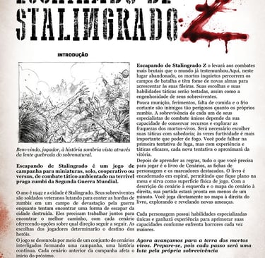 Escapando de Stalingrado é um jogo de campanha para miniaturas, solo, cooperativo ou versus, de combate tático ambientado na terrível praga zumbi da Segunda Guerra Mundial.